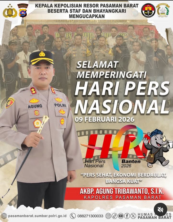 Kepala Kepolisian Resor Pasaman Barat, AKBP Agung Tribawanto, S.I.K., bersama staf dan Bhayangkari menyampaikan ucapan selamat memperingati Hari Pers Nasional 2026 dengan mengusung tema nasional “Pers Sehat, Ekonomi Berdaulat, Bangsa Kuat.” Tema tersebut dinilai sejalan dengan semangat kebangsaan dan tantangan zaman yang menuntut pers tetap independen, profesional, dan beretika.