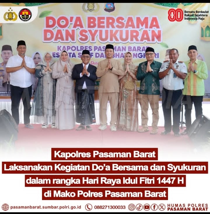 PASAMAN BARAT | Di tengah suasana Idul Fitri 1447 Hijriah, Mako Polres Pasaman Barat menjadi ruang pertemuan yang tidak hanya menghadirkan doa, tetapi juga kehangatan. Kapolres Pasaman Barat, AKBP Agung Tribawanto, S.I.K., memimpin langsung kegiatan doa bersama dan syukuran yang berlangsung khidmat dan penuh makna.