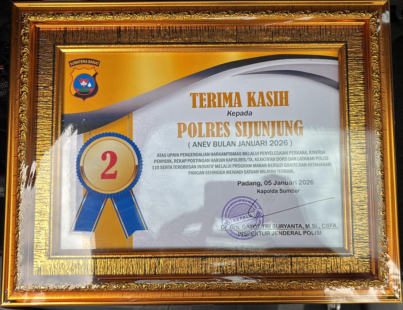 Penghargaan atas capaian tersebut diterima langsung oleh Kapolres Sijunjung AKBP Willian Harbensyah dan diserahkan secara resmi oleh Kapolda Sumatera Barat Irjen Pol Dr. Drs. Gatot Tri Suryanta, M.Si., CSFA. Momentum ini menjadi pengakuan institusional terhadap kerja keras jajaran Polres Sijunjung dalam menjalankan tugas-tugas kepolisian secara profesional dan terukur.