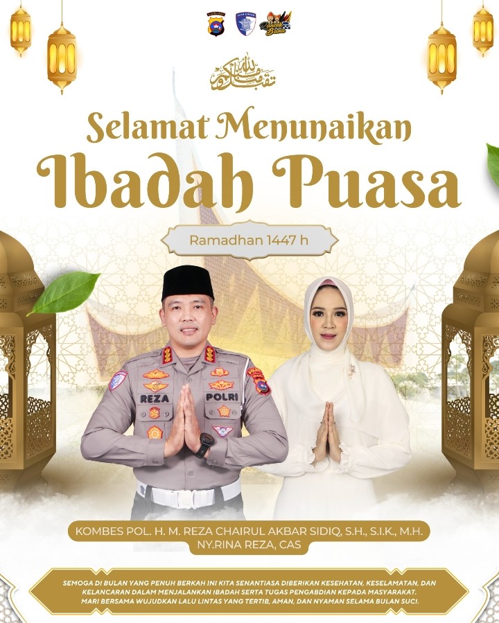 SUMBAR | Menyambut datangnya bulan suci Ramadhan 1447 Hijriah, suasana religius dan penuh harap menyelimuti Sumatera Barat. Di tengah semangat memperbaiki diri dan memperkuat keimanan, Direktur Lalu Lintas Polda Sumatera Barat, Kombes Pol. H. M. Reza Chairul Akbar Sidiq, S.H., S.I.K., M.H., menyampaikan ucapan selamat menunaikan ibadah puasa kepada seluruh masyarakat.
